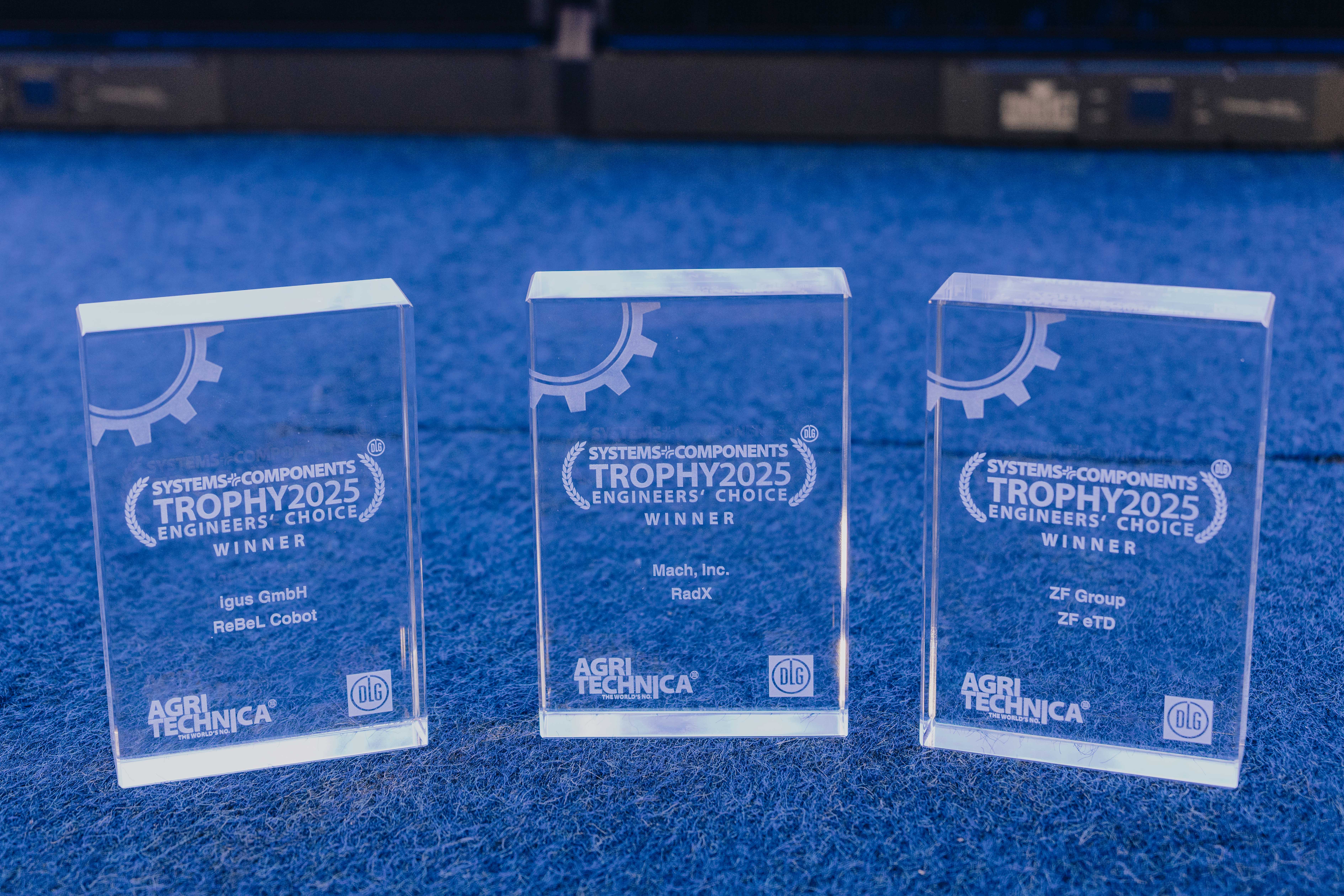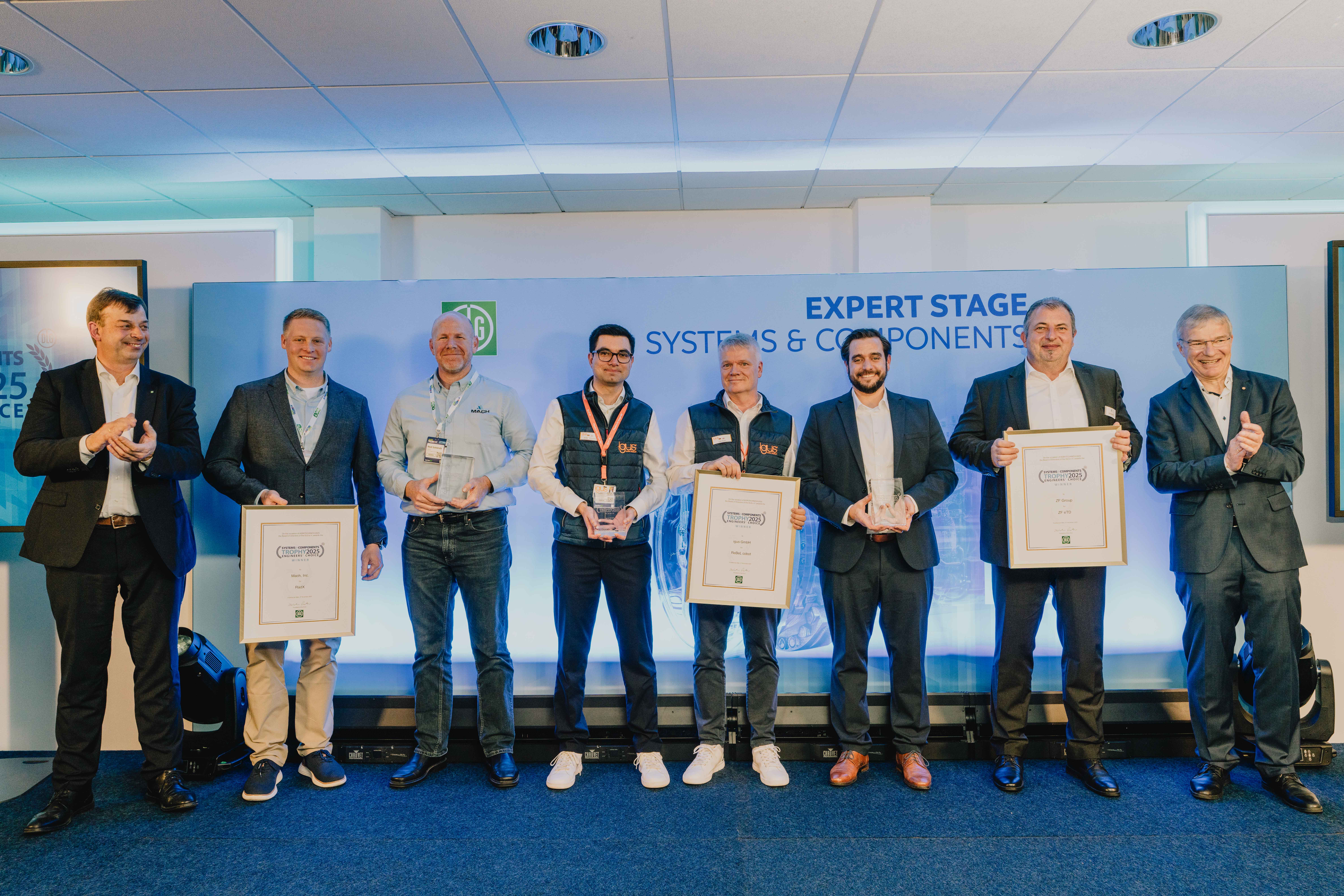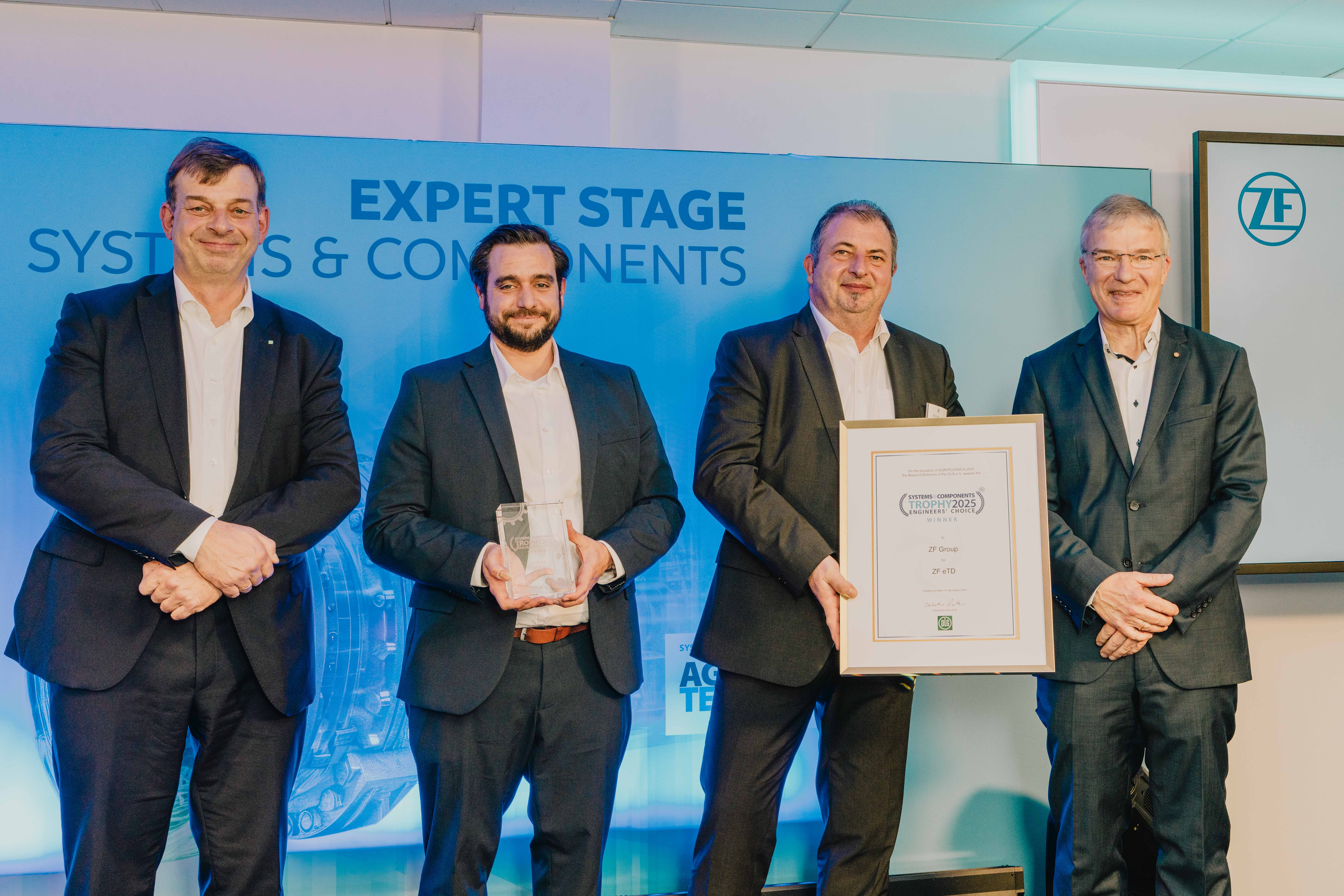 Hubertus Paetow (left) and Prof Dr Till Meinel (right) present the award to Dirk Brannolte - Head of Agricultural Machinery Systems (3rd from left) and Samuel Willems - Technical Project Manager for Agricultural Machinery Systems (2nd from left) from the ZF Group