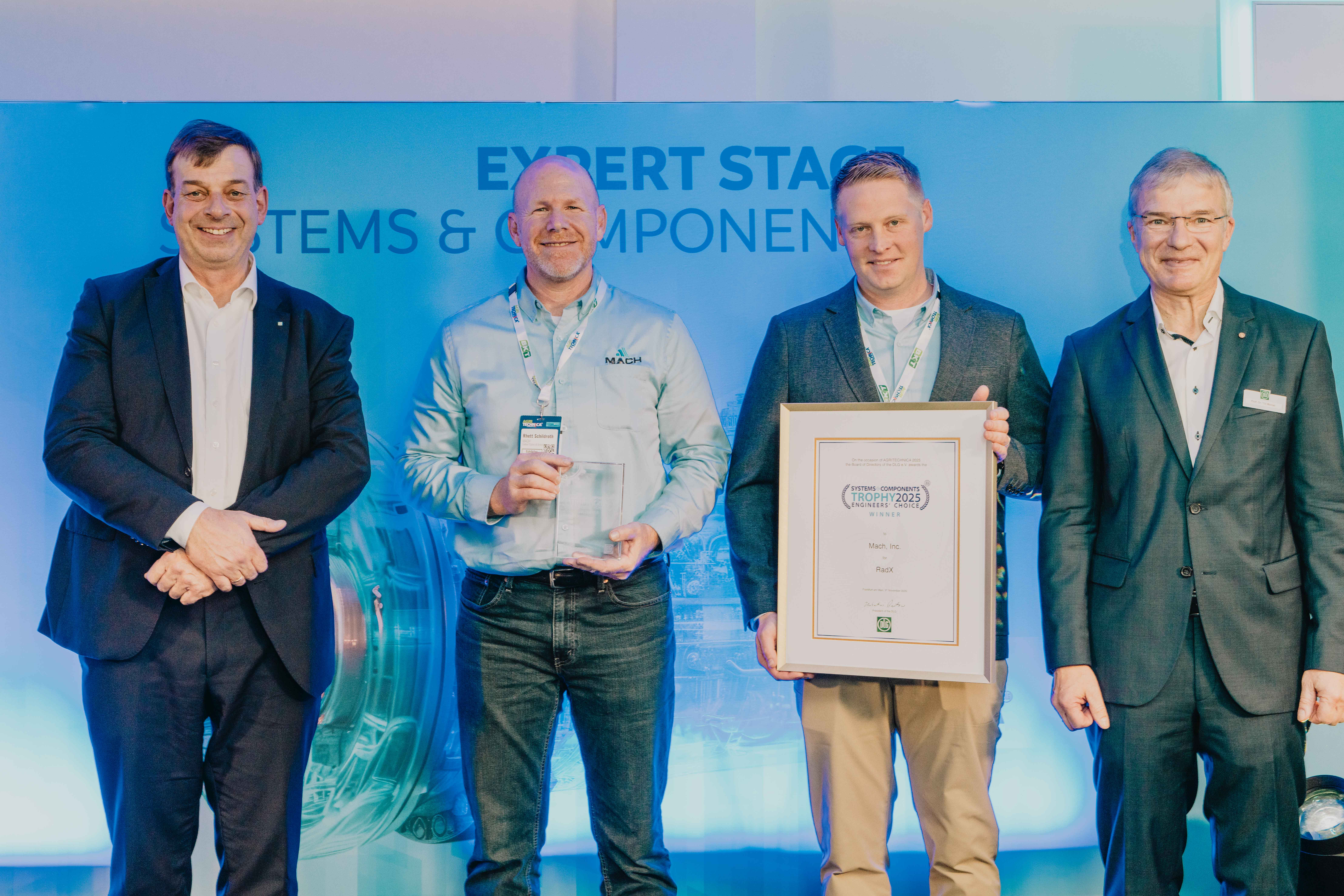 Hubertus Paetow (left) and Prof Dr Till Meinel (right) present the award to Rhett Schildroth, CTO MACH (2nd from left) and Colin Hurd, CEO MACH (3rd from left)